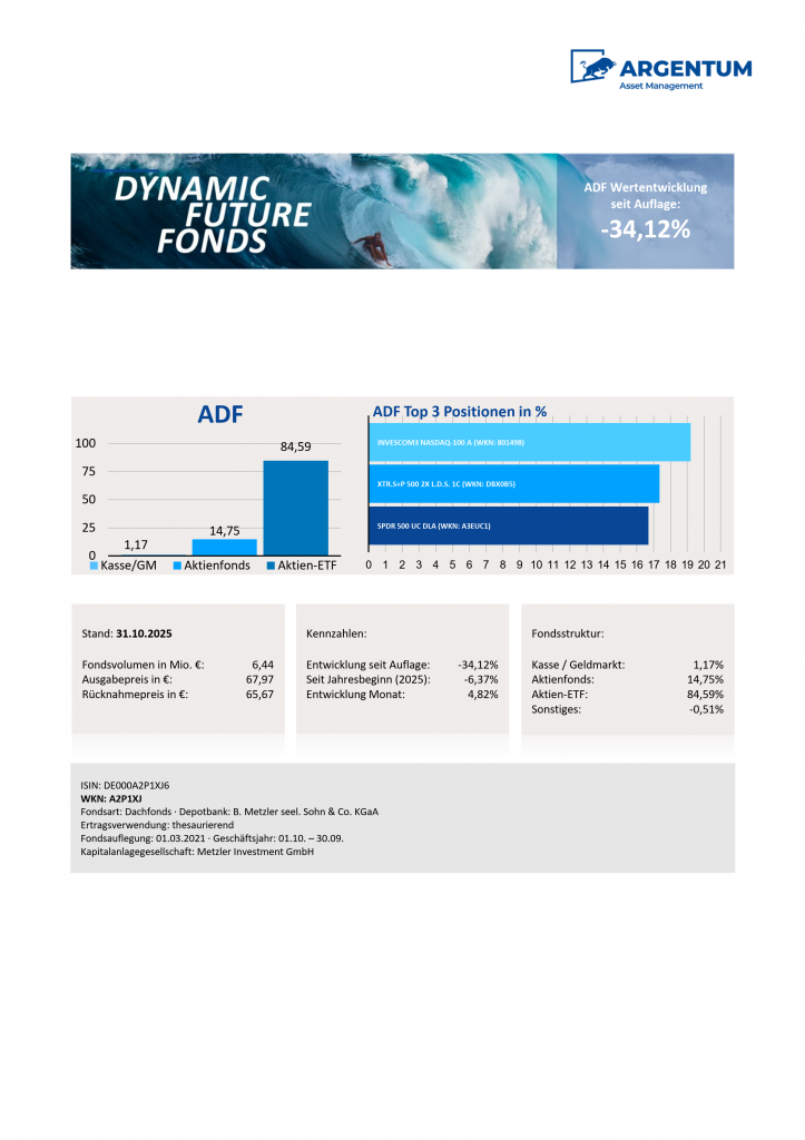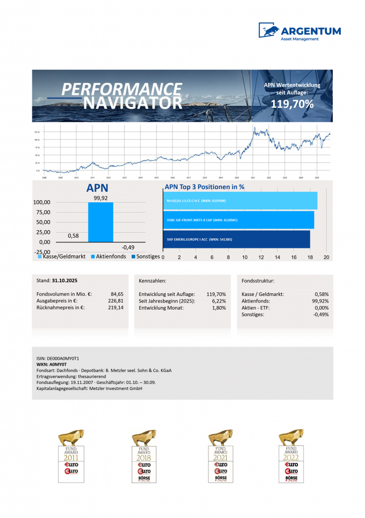 Unsere Dachfonds ARGENTUM Stabilitäts-Portfolio (WKN: A1C699 / ISIN: DE000A1C6992), ARGENTUM Performance Navigator (WKN: A0MY0T / ISIN: DE000A0MY0T1) und ARGENTUM Dynamic Future (WKN: A2P1XJ / ISIN: DE000A2P1XJ6) zeigen sich weiterhin in guter Verfassung und haben den positiven Trend der vergangenen Monate fortgeführt. Unser defensives ARGENTUM Stabilitäts-Portfolio legte 0,55 Prozent zu, die ausgewogene Strategie ARGENTUM Performance Navigator 1,80 Prozent und der eher offensiv agierende ARGENTUM Dynamic Future 4,82 Prozent. Das führt auf Sicht von zwölf Monaten zu einer Performance von 2,39 Prozent beim ARGENTUM Stabilitäts-Portfolio und von 9,18 Prozent beim ARGENTUM Performance Navigator. Zwar liegt unser ARGENTUM Dynamic Future aufgrund der schwierigen Entwicklung im Frühjahr seit Oktober 2024 leicht im Plus mit 0,03 Prozent, doch die Fondsperformance von fast 24 Prozent in den vergangenen sechs Monaten weist eine stark positive Tendenz auf. Wir sind überzeugt, dass der langfristige Ansatz der Strategie in naher bis mittlerer Zukunft zu einer positiven Wertentwicklung und damit auch zu einem stabilen Performancebeitrag für Sie führen wird.