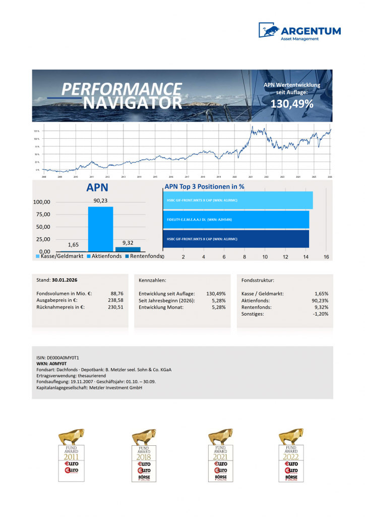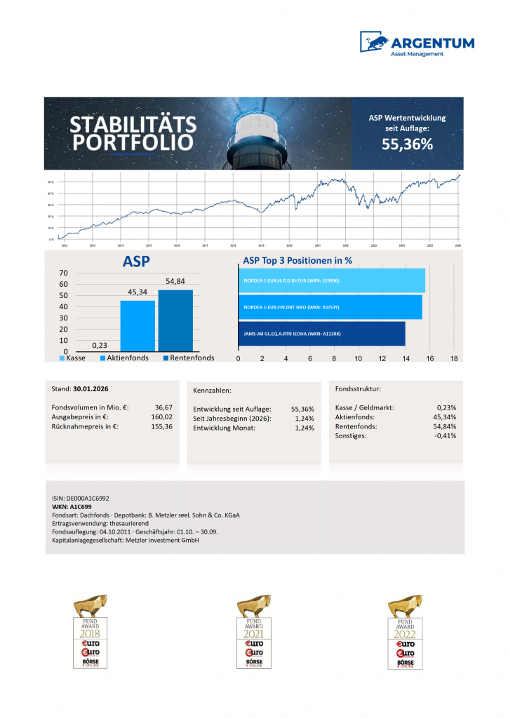 Die schwächere Entwicklung des ARGENTUM Dynamic Future im vergangenen Jahr ist vor allem Ausdruck eines herausfordernden Marktregimes für Wachstums- und Trendwerte – insbesondere getrieben durch den US-Zollknall und die USD-Abwertung – und weniger ein Hinweis darauf, dass die zugrunde liegenden Chancen an Relevanz verlieren. Für Anleger mit langfristigem Anlagehorizont bleibt der Fokus auf strukturelle Zukunftsthemen ein sinnvoller Baustein, weil er Zugang zu Bereichen eröffnet, die potenziell überdurchschnittliches Wachstum bieten und von tiefgreifenden Transformationen getragen werden. Entscheidend ist dabei die Bereitschaft, kurzfristige Schwankungen in Kauf zu nehmen, um langfristig an den Gewinnern dieser Transformationsprozesse partizipieren zu können.