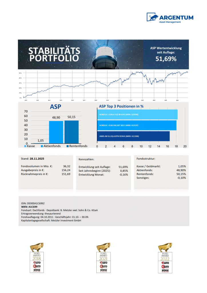 Für unsere ARGENTUM-Dachfonds heißt das: Wir setzen unsere Strategien weiterhin mit klarem Fokus auf Qualität, Widerstandsfähigkeit und Diversifikation um – und stehen Ihnen dabei jederzeit verlässlich zur Seite. Erfolgreiches Fondsmanagement erfordert eine besonnene Steuerung, besonders in einem Umfeld, das auf kleinste Veränderungen sensibel reagiert. Wir danken Ihnen herzlich für Ihr Vertrauen und wünschen Ihnen und Ihren Familien eine besinnliche Adventszeit sowie einen guten Start in das neue Jahr, voller Zuversicht, Gesundheit und Erfolg.