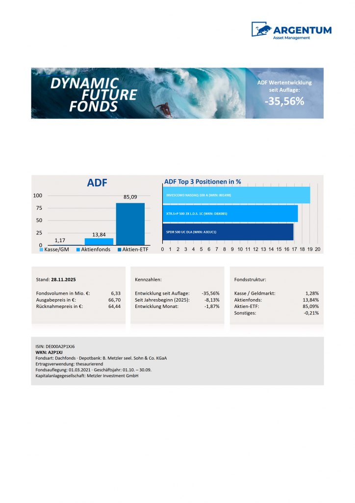 Unsere Dachfonds ARGENTUM Stabilitäts-Portfolio (WKN: A1C699 / ISIN: DE000A1C6992), ARGENTUM Performance Navigator (WKN: A0MY0T / ISIN: DE000A0MY0T1) und ARGENTUM Dynamic Future (WKN: A2P1XJ / ISIN: DE000A2P1XJ6) haben sich in einem anspruchsvollen Marktumfeld insgesamt robust behauptet. Im November verzeichnete das defensiv ausgerichtete ARGENTUM Stabilitäts-Portfolio mit -0,16 Prozent praktisch eine Seitwärtsbewegung, der ausgewogene ARGENTUM Performance Navigator gab um 1,04 Prozent nach, während der offensivere ARGENTUM Dynamic Future mit -1,87 Prozent korrigierte. Auf Jahressicht seit Jahresbeginn liegen Stabilitäts-Portfolio und Performance Navigator mit 0,85 beziehungsweise 5,11 Prozent weiterhin im positiven Bereich, während der Dynamic Future nach dem schwachen Frühjahr mit -8,13 Prozent seit Jahresanfang noch Aufholpotenzial aufweist. Entscheidend ist für uns jedoch weniger die Momentaufnahme eines einzelnen Monats, sondern die langfristige Ausrichtung der drei Strategien im Zusammenspiel: Gemeinsam bilden sie einen Baukasten, mit dem wir Schwankungen über verschiedene Risikobudgets hinweg abfedern und zugleich die Ausgangsbasis für künftige Erholungsphasen sichern.
