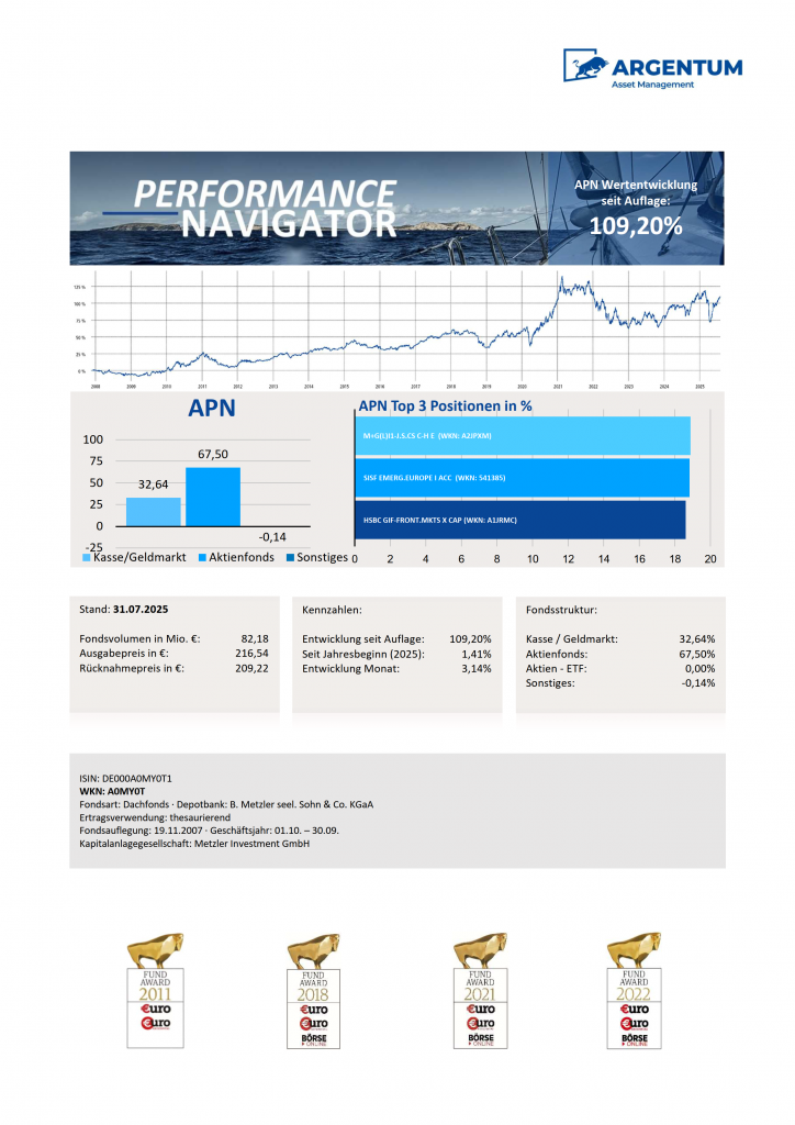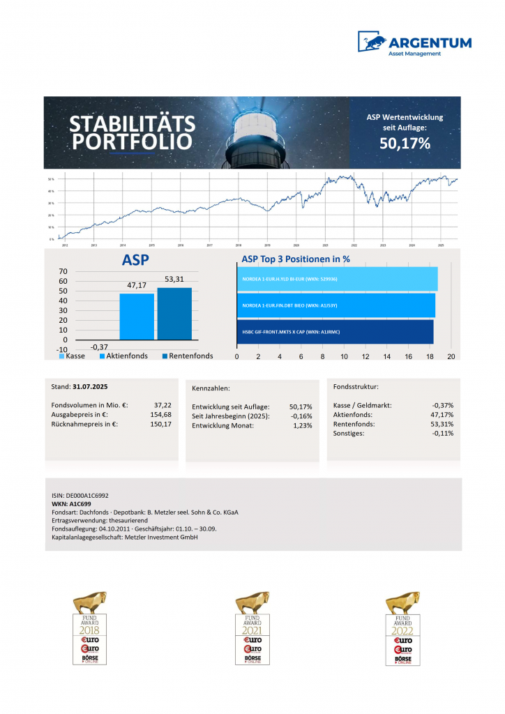 Unsere Dachfonds ARGENTUM Stabilitäts-Portfolio (WKN: A1C699 / ISIN: DE000A1C6992), ARGENTUM Performance Navigator (WKN: A0MY0T / ISIN: DE000A0MY0T1) und ARGENTUM Dynamic Future (WKN: A2P1XJ / ISIN: DE000A2P1XJ6) präsentieren sich weiterhin in sehr guter Verfassung und konnten den Rückenwind an den Märkten für eine positive Entwicklung nutzen.